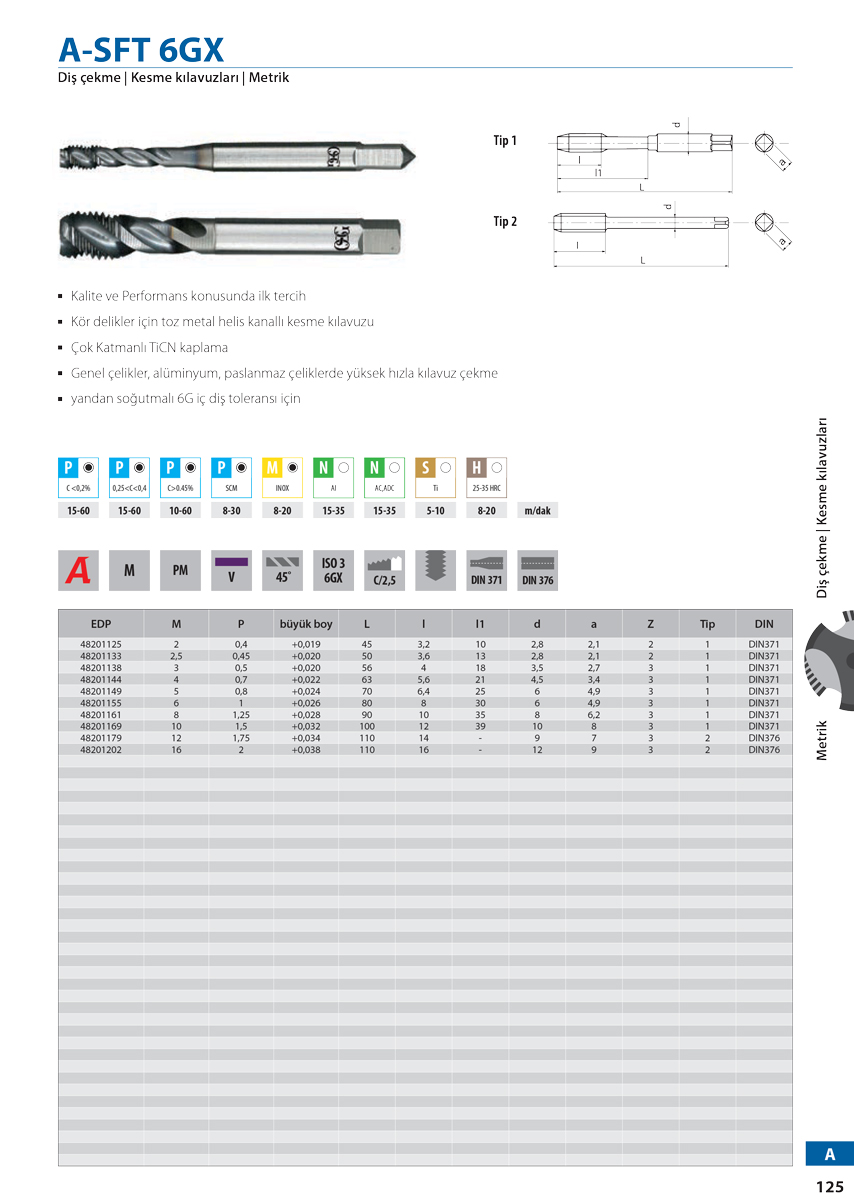 • Genel çelikler, alüminyum, paslanmaz çeliklerde yüksek hızla kılavuz çekme yandan soğutmalı 6G iç diş toleransı için