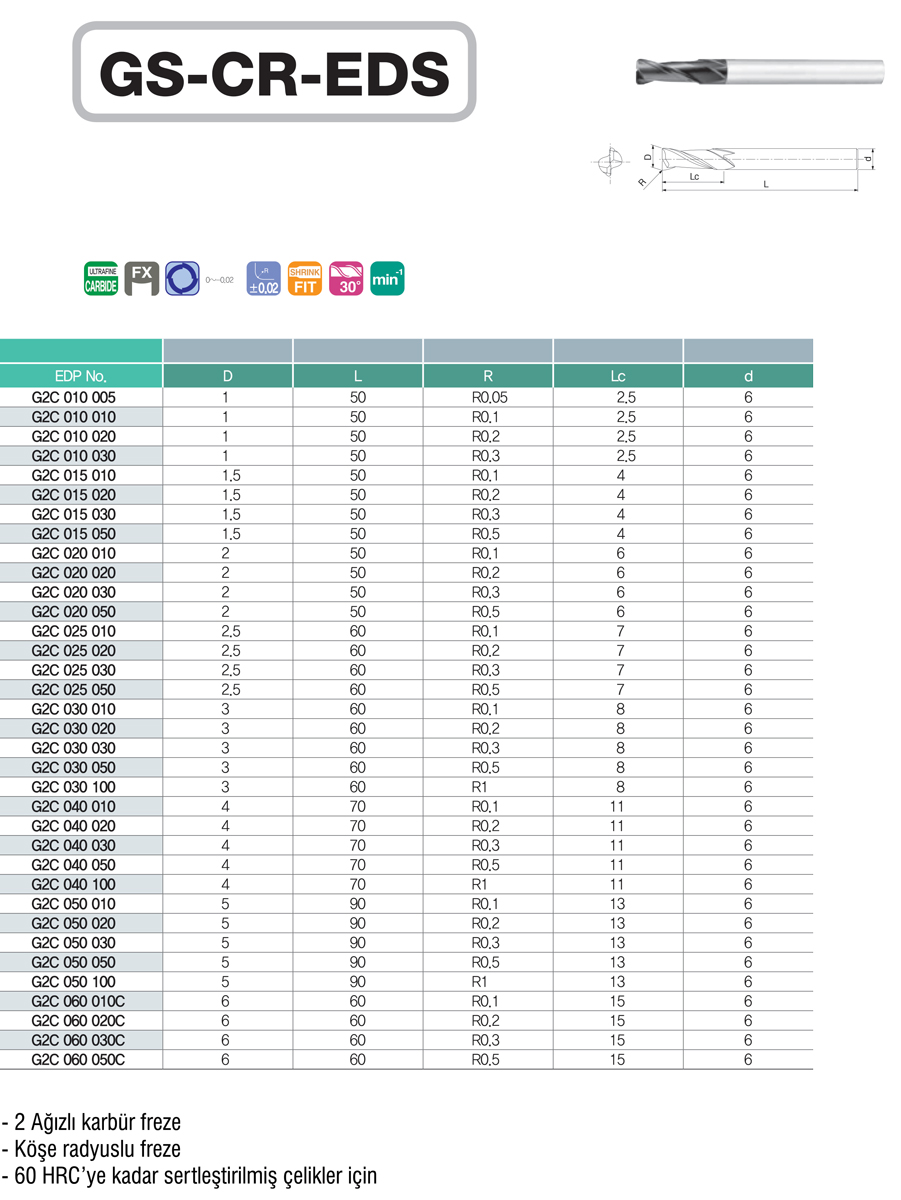 - 60 HRC’ye kadar sertleştirilmiş çelikler için