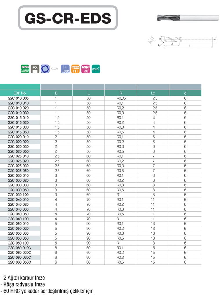 - 60 HRC’ye kadar sertleştirilmiş çelikler için