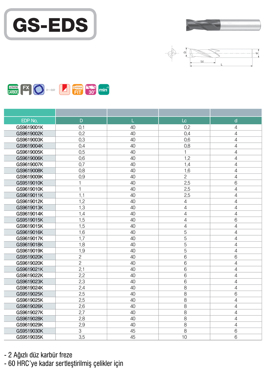 - 60 HRC’ye kadar sertleştirilmiş çelikler için