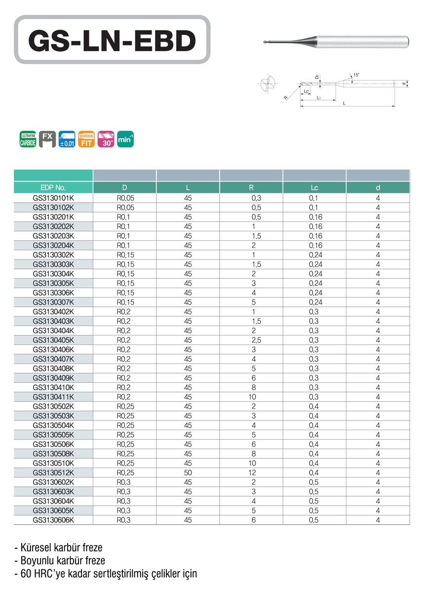 • 60 HRC’ye kadar sertleştirilmiş çelikler için