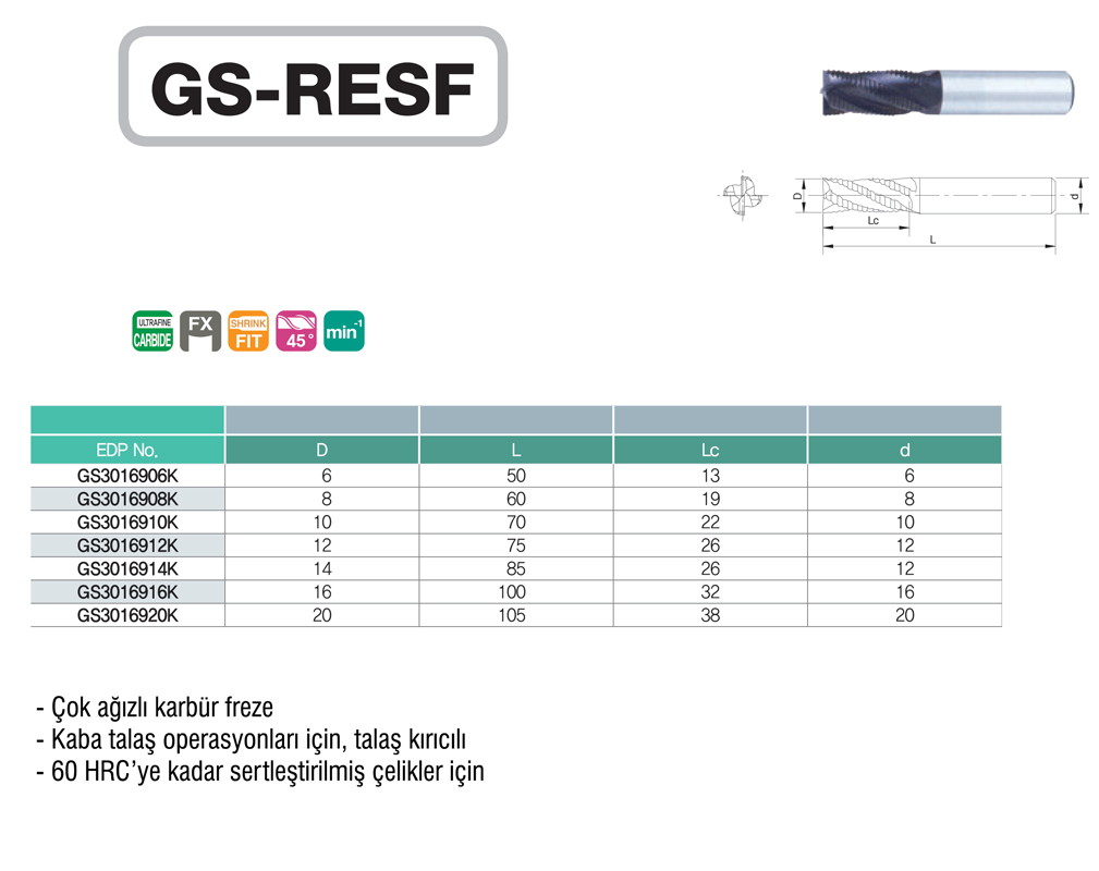 - 60 HRC’ye kadar sertleştirilmiş çelikler için