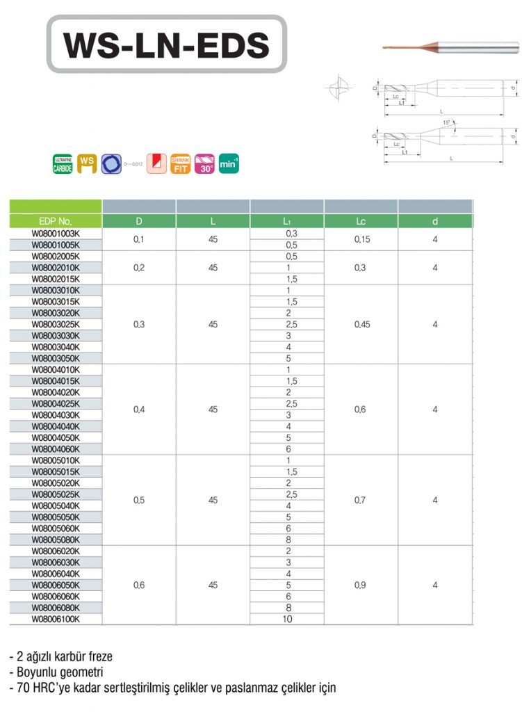 - 70 HRC’ye kadar sertleştirilmiş çelikler ve paslanmaz çelikler için